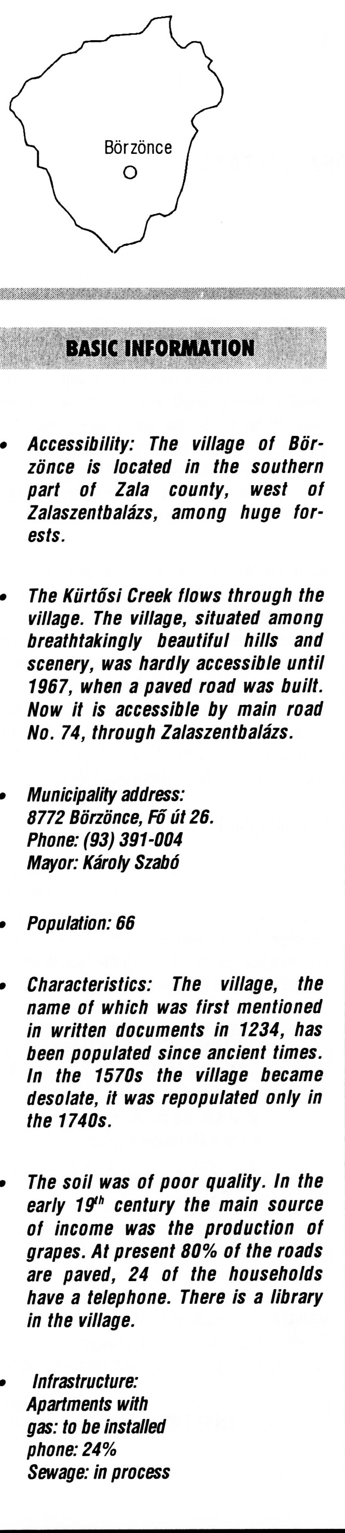Nyilvános 2254 | 6095 | Börzönce | BASIC INFORMATION Accessibility: The village of Börzönce is located in the southern part of Zala county, west of Zalaszentbalázs, among huge forests. The Kürtősi Creek flows through the village. The village, situated among breathtakingly beautiful hills and scenery, was hardly accessible until 1967, when a paved road was built. Now it is accessible by main road No. 74, through Zalaszentbalázs. Municipality address: 8772 Börzönce, Fő út 26. Phone: (93) 391-004 Mayor: Károly Szabó Population: 66 Characteristics: The village, the name of which was first mentioned in written documents in 1234, has been populated since ancient times. In the 1570s the village became desolate, it was repopulated only in the 1740s. The soil was of poor quality. In the early 19th century the main source of income was the production of grapes. At present 80% of the roads are paved, 24 of the households have a telephone. There is a library in the village. Infrastructure: Apartments with gas: to be installed phone: 24% Sewage: in process This text came from the following book: Title: Handbook of Zala county (Zala megye kézikönyve) Series: County handbooks of Hungary (Magyarország megyei kézikönyvei) Chief editor: Hóbor József Publisher: (Hatvan), CEBA-Hungary Ltd, 1998 ETO: 908.439.121(035) ; 050.8(439.121) ISBN: 963-9089-18-2 Pages: 488-1040 p. Remark: Closed on: 1998. márc. 31. |