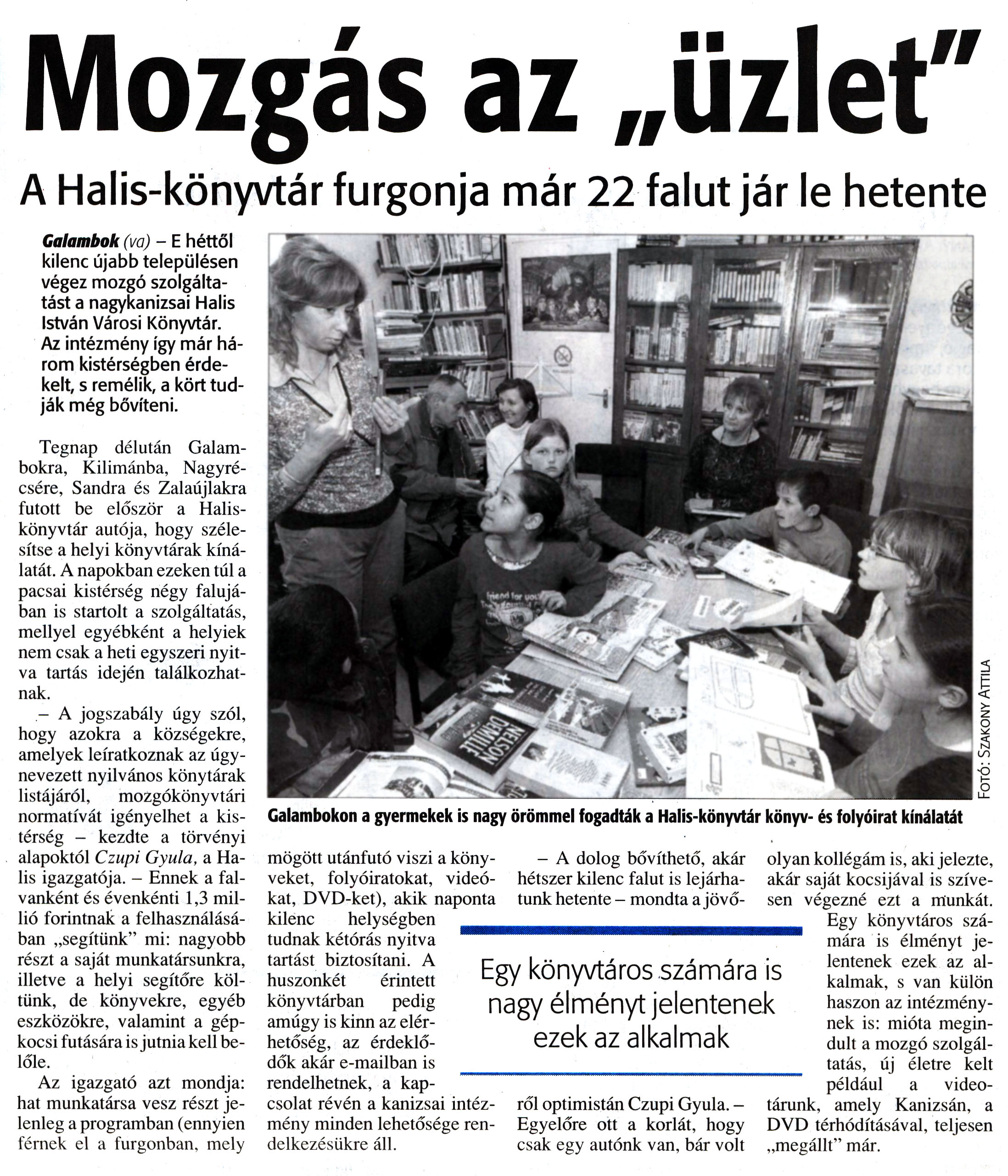 Nyilvános 7428 | 15021 | Zalai Hírlap 2008. március 14. 4. oldal - Mozgás az üzlet | Mozgás az „üzlet" A Halis-könyvtár furgonja már 22 falut jár le hetente Galambok (va) - E héttől kilenc újabb településen végez mozgó szolgáltatást a nagykanizsai Halis István Városi Könyvtár. Az intézmény így már három kistérségben érdekelt, s remélik, a kört tudják még bővíteni. Tegnap délután Galambokra, Kilimánba, Nagyrécsére, Sandra és Zalaújlakra futott be először a Halis-könyvtár autója, hogy szélesítse a helyi könyvtárak kínálatát. A napokban ezeken túl a pacsai kistérség négy falujában is startolt a szolgáltatás, mellyel egyébként a helyiek nem csak a heti egyszeri nyitva tartás idején találkozhatnak. - A jogszabály úgy szól, hogy azokra a községekre, amelyek leiratkoznak az úgynevezett nyilvános könytárak listájáról, mozgókönyvtári normatívát igényelhet a kistérség — kezdte a törvényi alapoktól Czupi Gyula, a Halis igazgatója. - Ennek a falvanként és évenkénti 1,3 millió forintnak a felhasználásában „segítünk" mi: nagyobb részt a saját munkatársunkra, illetve a helyi segítőre költünk, de könyvekre, egyéb eszközökre, valamint a gépkocsi futására is jutnia kell belőle. Az igazgató azt mondja: hat munkatársa vesz részt jelenleg a programban (ennyien férnek el a furgonban, mely mögött utánfutó viszi a könyveket, folyóiratokat, videókat, DVD-ket), akik naponta kilenc helységben tudnak kétórás nyitva tartást biztosítani. A huszonkét érintett könyvtárban pedig amúgy is kinn az elérhetőség, az érdeklődők akár e-mailban is rendelhetnek, a kapcsolat révén a kanizsai intézmény minden lehetősége rendelkezésükre áll. - A dolog bővíthető, akár hétszer kilenc falut is lejárhatunk hetente - mondta a jövőről optimistán Czupi Gyula. - Egyelőre ott a korlát, hogy csak egy autónk van, bár volt olyan kollégám is, aki jelezte, akár saját kocsijával is szívesen végezné ezt a munkát. Egy könyvtáros számára is élményt jelentenek ezek az alkalmak, s van külön haszon az intézménynek is: mióta megindult a mozgó szolgáltatás, új életre kelt például a video-tárunk, amely Kanizsán, a DVD térhódításával, teljesen „megállt" már. |