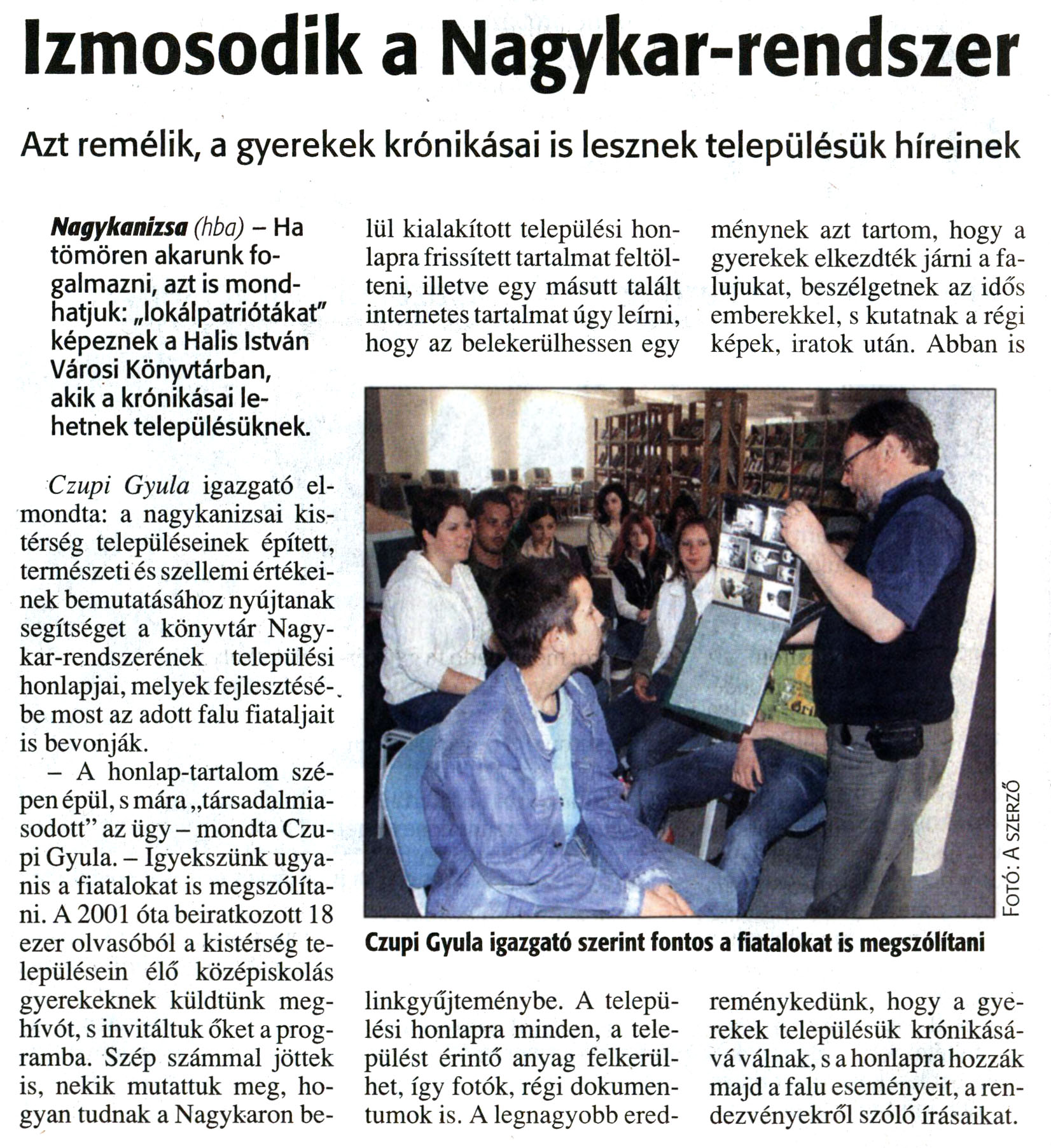 Nyilvános 14213 | 28425 | Zalai Hírlap 2008. június 9. 133. szám 12. oldal - Izmosodik a Nagykar-rendszer | A cikk szövege: Izmosodik a Nagykar-rendszer Azt remélik, a gyerekek krónikásai is lesznek településük híreinek Nagykanizsa (hba) - Ha tömören akarunk fogalmazni, azt is mondhatjuk: „lokálpatriótákat" képeznek a Halis István Városi Könyvtárban, akik a krónikásai lehetnek településüknek. Czupi Gyula igazgató elmondta: a nagykanizsai kistérség településeinek épített, természeti és szellemi értékeinek bemutatásához nyújtanak segítséget a könyvtár Nagykar-rendszerének települési honlapjai, melyek fejlesztésébe most az adott falu fiataljait is bevonják. - A honlap-tartalom szépen épül, s mára „társadalmiasodott" az ügy - mondta Czupi Gyula. - Igyekszünk ugyanis a fiatalokat is megszólítani. A 2001 óta beiratkozott 18 ezer olvasóból a kistérség településein élő középiskolás gyerekeknek küldtünk meghívót, s invitáltuk őket a programba. Szép számmal jöttek is, nekik mutattuk meg, hogyan tudnak a Nagykaron belül kialakított települési honlapra frissített tartalmat feltölteni, illetve egy másutt talált internetes tartalmat úgy leírni, hogy az belekerülhessen egy linkgyűjteménybe. A települési honlapra minden, a települést érintő anyag felkerülhet, így fotók, régi dokumentumok is. A legnagyobb eredménynek azt tartom, hogy a gyerekek elkezdték járni a falujukat, beszélgetnek az idős emberekkel, s kutatnak a régi képek, iratok után. Abban is reménykedünk, hogy a gyerekek településük krónikásává válnak, s a honlapra hozzák majd a falu eseményeit, a rendezvényekről szóló írásaikat. Képaláírás: Czupi Gyula igazgató szerint fontos a fiatalokat is megszólítani |